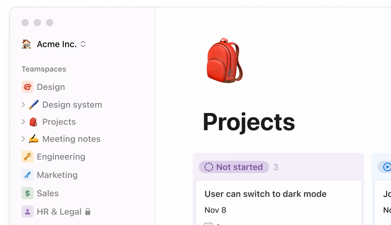 Mantén a todos alineados en todo—proyectos, notas de reuniones, decisiones, procesos y archivos—todo fácilmente accesible en un solo lugar precioso